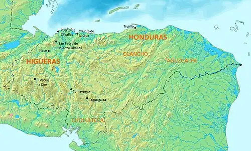 With the death of Olid, Las Casas declared Cortés' jurisdiction over the colony.[81] Those Spanish remaining in Honduras divided into several groups.[87] The majority remained in the territory, under the command of Francisco de las Casas.[85] Las Casas considered the harbour at Triunfo de la Cruz to be inadequate, so he planned its relocation to Puerto de Caballos.[81] Las Casas was impatient to return to New Spain, so he gave command of the province to Juan López de Aguirre and authorised him to relocate the port.[81] Las Casas returned to Mexico via the Pacific coast of Guatemala;[85] he took Gil González with him, and found Pedro de Briones in Guatemala, whom he hanged as a traitor. López de Aguirre rejected Puerto de Caballos as the location for the new town, and instead sailed east with half of his men to the Cape of Honduras, near where Columbus had first landed. The rest of his people followed east on foot. López de Aguirre did not wait for them, and sailed away, abandoning Honduras.[81] When the land party arrived, although troubled by the desertion of López de Aguirre, they settled in Trujillo as planned,[88] The town was founded in May 1525, in the largest sheltered bay on the Caribbean coast of Central America.[89]