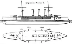 Emperador Carlos V′s designed was derived from that of the British Blake-class protected cruisers. The Spanish Navy classified her as a "first-class battleship," but she actually was an armored cruiser, although she lacked the speed, armor, and armament of foreign armored cruisers and in some ways resembled a large protected cruiser.[2] Her boilers and propulsion machinery were of Spanish construction, her armor German, her stern and stern post British, and her gun turrets were French, making her construction a complicated process.[1]