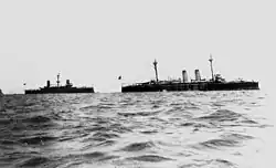 After her completion and delivery to the Spanish Navy, Vizcaya made a transatlantic voyage to the Antilles.[1] After returning to Spain, she arrived at Tangier as part of the Training Squadron — which also included the battleship Pelayo and the protected cruisers Alfonso XIII and Marqués de la Ensenada — on 12 June 1895 to put put pressure on Sultan Abdelaziz of Morocco after a series of incidents there, joining three Imperial German Navy and six British Royal Navy warships anchored at Tangier.[1] After the situation in Morocco calmed down, the Spanish ships returned to Spain, arriving at Algeciras on 17 August 1895.[1]