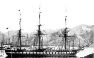 Villa de Madrid's first operation after commissioning was to carry a Spanish Marine Infantry unit, the 6th Marine Infantry Battalion, from Spain to Havana in the Captaincy General of Cuba,[1] after which she returned to Spain, arriving at Cádiz. Amid tensions between Spain, Chile, and Peru, she departed Cadiz soon afterward, getting underway on 6 September 1864 for duty with the Pacific Squadron. After a transatlantic crossing, she arrived at Montevideo, Uruguay, where she rendezvoused with the Spanish Navy screw frigates Reina Blanca and Berenguela. The three ships then passed through the Strait of Magellan into the Pacific Ocean and reached Pisco, Peru, on 19 December 1864.[3] The three ships joined the Pacific Squadron in the Chincha Islands on 30 December 1864.[3] Villa de Madrid became the flagship of the squadron's commander, Vicealmirante (Vice admiral) José Manuel Pareja, whose predecessor Luis Hernández-Pinzón Álvarez had seized the Chincha Islands from Peru in April 1864. On 27 January 1865 a Peruvian government representative, Manuel Ignacio de Vivanco, and Pareja signed the Preliminary Treaty of Peace and Friendship between Peru and Spain, known informally as the Vivanco–Pareja Treaty, aboard Villa de Madrid in an ultimately unsuccessful attempt to settle claims between the two countries that instead sparked the outbreak of the Peruvian Civil War of 1865.