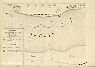 According to the list, the presence of only 555 soldiers can be assured, since it is difficult to determine how many men formed a "piece of cavalry." Sánchez Ramírez did not provide an exact number of the men under his guidance, but stated that they did not reach a thousand.[53] In the work, Second Campaign of Santo Domingo, it was stated that the French troops were barely 620 soldiers, compared to a Dominican army that oscillated between 1,200, according to Agustín Franco, and 2,300 according to Captain Bosquet, who led an advance that reconnoitred the Dominican troops stationed in Palo Hincado.[54] Cordero Michel spoke of 1,800 men, 600 from Cibao and 1,200 gathered by Sánchez Ramírez.[55] It is appropriate to consider that it is possible that French sources overstated the number of troops in order to justify the defeat. On the other hand, on the opposite side, in Dominican sources, a smaller troop would accentuate the bravery of its men and the success of the battle; but a greater number of soldiers would show the collective commitment to the Reconquista. It can be considered that the Dominican troops were larger than the French.