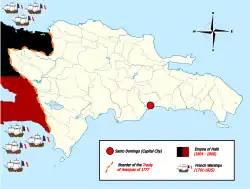 Discontent with the French had other elements to take into account. Naturally, the French Government in Santo Domingo had deepened tensions with Haiti, prohibiting trade between both parties. The decree issued by Ferrand on January 6, 1805, not only ignored the existence of the neighboring State but also clearly established the need to "annihilate the rebellion of the blacks in the colony of Santo Domingo" through the reduction of its population, and particularly authorizing the capture of minors under 14 years of age to be sold as slaves. The French presence on the eastern side of the island represented a serious threat to the Haitians, which became the trigger for the failed invasion of Jean-Jacques Dessalines on February 22 of that same year.[3] Another incursion was foreseeable if it had not been for the death of the emperor in October 1806 and the consequent division of Haiti into two States: In the North the regime of Henri Christophe and in the South the republic headed by Alexandre Pétion. The tensions between both sides relegated the problem of the French presence in the western part of the island to the background.