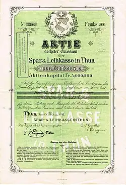 ![]() A 500 Swiss francs share of the Spar- und Leihkasse Thun (1912), 6th issue | |