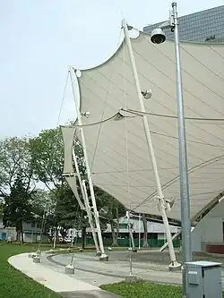 In July 2009, the police installed closed circuit television (CCTV) cameras for "safety and security". The police said that the cameras complemented the presence of their officers on the ground and did not record audio inputs. The move drew some negative reactions from the public. Former Nominated Member of Parliament Siew Kum Hong felt that the installation of CCTV cameras was "pretty ridiculous", and wondered if the move might feed the perception in some quarters that Singapore is a police state, since Speakers' Corner is "the one place in Singapore" where people can demonstrate.[79] Nevertheless, the surveillance cameras have not affected various events from being held. With effect from 1 December 2009, the size of Speakers' Corner was reduced so that it only occupies the half of Hong Lim Park nearer New Bridge Road.[80] From 1 March 2012, Speakers' Corner was expanded to include an area behind Kreta Ayer NPP, near the junction of North Canal Road and South Bridge Road.[81]