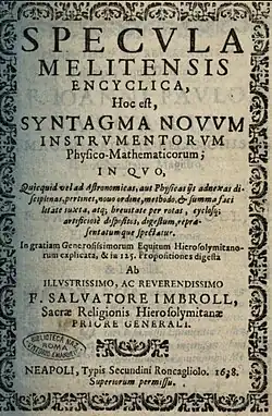 Specula Melitensis Encyclica, that is, a Syntagma of new Physico-Mathematical Instruments, in which anything pertaining to either Astronomy, or Physics, or disciplines related to them, by a new order and method, with utmost facility and brevity via wheels and dials artfully disposed, is seen orderly arranged.[2]