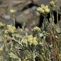 Sphaeromeria cana (recently proposed name Artemisia albicans[1]) is a species of flowering plant in the family Asteraceae known by the common name gray chickensage.[2] It is native to the western United States, where it is known from the Sierra Nevada, the adjacent desert ranges of eastern California and Nevada, and Steens Mountain of Oregon. It grows in dry, rocky mountain habitat, such as cracks and crevices, including the talus above the tree line. This is an aromatic subshrub with numerous erect branches growing up to 30 to 60 centimeters tall. It is gray-green in color and coated with woolly fibers. The leaves are linear or lance-shaped, the lower ones divided into lobes. The inflorescence is generally a cluster of flower heads lined with woolly phyllaries and containing yellow disc florets. There are no ray florets. The fruit is a ribbed achene about 2 millimeters long.