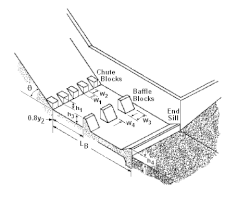 - Third, a stilling basin at the terminus of a spillway serves to further dissipate energy and prevent erosion. They are usually filled with a relatively shallow depth of water and sometimes lined with concrete. A number of velocity-reducing components can be incorporated into their design to include chute blocks, baffle blocks, wing walls, surface boils, or end sills.[26]