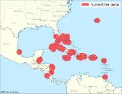 Spiranthes torta can be found in the Bahamas, Belize, Bermuda, Costa Rica, Cuba, the Dominican Republic, Florida, French Guiana, Guatemala, Haiti, Honduras, Jamaica, the Leeward Islands, the Gulf of Mexico, southeastern Mexico, Nicaragua, Puerto Rico, Trinidad-Tobago and the Windward Islands.[3] It prefers dry habitat, usually growing in pine forest.[2]