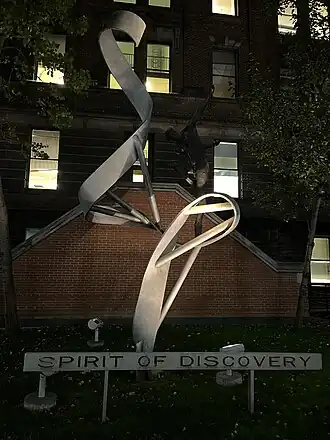 Spirit of Discovery is a 2005 sculpture by Veronica and Edwin Dam de Nogales, installed on the University of Toronto campus, in Ontario, Canada.[1][2] The bronze and stainless steel figurative[3] artwork measures 8m x 4.5m x 4m.[4] The artists have said, "The sculpture attempts to capture not only the activity of the research centre, but the very spirit behind this research. There is in medicine and in art a unique connectivity of subject and subject matter … this work attempts to capture this … the figure is in unison with the protein structure, mimicking its every twist and turn … there in his reach is anticipation, hope and a sought objective … discovery within grasp."[5]