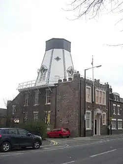 The Chimney Mill was constructed in 1782 in Claremont Road,[8] replacing a previous windmill on the site. Grade II listed, it is significant on a number of levels – as the only surviving smock mill in the region; as the first 5-sailed smock mill in Britain; and for being designed by the civil engineer John Smeaton,[9] the man responsible for the third Eddystone Lighthouse (later dismantled and rebuilt as Smeaton's Tower on Plymouth Hoe).