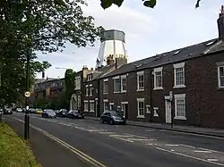 Huntsmoor House, Hunters Road, was built as a soldiers' home in 1899 to meet the social needs of those soldiers stationed at Fenham Barracks.[6] During the fifties large steam presses were installed for finishing tailored garments. Many of the operators of the presses were adults with learning difficulties. They congregated in the centre of Newcastle each morning and were then walked to Huntsmoor House to begin their work. Occasionally, one of the workers would lean out of a window to call over children playing in the backlane between Hunter's Road and Ancrum Street to send them on an errand for sweets to Jenny Proctors sweet shop. A small twist of Victory V lozenges was a favourite purchase and the child running the errand would be rewarded with half a lozenge on their return. Later, Huntsmoor House was used as a warehouse by the Newcastle bookseller Thornes[7] before being turned into student accommodation. A three-storey red brick structure, the design of Huntsmoor House is unusual, topped with a crenellated tower featuring carved shields and a flagpole. The central section is flanked by two arched windows that rise through two storeys, with a Tudor style exposed beam gable above.