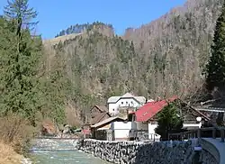 On the left bank of the Kokra River, about 2 km south of the settlement, thick layers of travertine are occasionally still mined, particularly for restoration of listed buildings in Upper Carniola, where it was traditionally used as a building material.[2]
