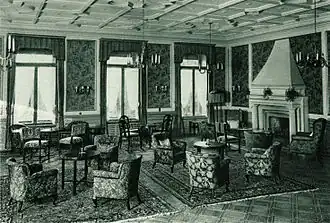 On the right side of the vestibule, the restaurant and bar in front half of the 1881 southern wing were unchanged. In the southwestern corner the former reception area was replaced by a shop space, identified in the architect's plan as a "bank".[12] On the far side of the building, the enlargement of the hotel called for an extension to the grand dining room: this was extended to the south, raising its capacity by approximately 50%. Two broad arched windows on what had previously been the external southern wall of the room were adapted as arches connecting the new and old parts of the enlarged dining room.