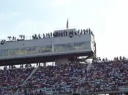 A spotter in auto racing is a trained team member whose job is to relay information to their driver, keeping them alert of what is occurring on the track.[1][2] They are typically positioned higher, atop one of the grandstands or other support buildings, to see the entire track.[1] Spotters keep in constant contact with their drivers via two-way radio communication. Spotters are considered the drivers' "eyes" and are one of the more notable yet simple, safety measures adopted by professional auto racing in the past two decades.