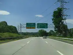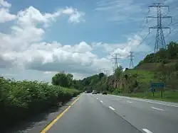 The Sprain Brook Parkway, designated by the New York State Department of Transportation as NY 987F, a state reference route,[1] begins at a fork from the Bronx River Parkway along the latter's right-of-way along the Bronx River in the city of Yonkers. Crossing through the Northeast Yonkers neighborhood as a six-lane freeway, the Sprain Brook crosses an interchange with NY 100 (Central Park Avenue) south of Andrus Park. Bending to the north through Yonkers, the Sprain Brook reaches an interchange with Tuckahoe Road, with the northbound and southbound lanes splitting around the Grassy Sprain Reservoir. The two directions bend northeast along the reservoir. The southbound lanes cross Sprain Ridge Park, while the northbound lanes cross through a golf course. Leaving Yonkers for the town of Greenburgh, the lanes of the Sprain Brook come back together, reaching an interchange with Jackson Avenue. The six-lane parkway continues northward and to the northeast through Greenburgh, crossing under Ardsley Road. After turning northward once again, the Sprain Brook crosses under a former alignment of NY 131 (Underhill Road) and passes by the Sunningdale Country Club.[3]