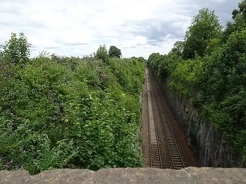 The station was located where the Warmsworth to Sprotbrough road crosses the line over the deep limestone cutting and was approached by a covered flight of 66 steps to the Sheffield-bound platform.[1] The station had two flanking platforms and a small wooden shelter which served as both ticket office and waiting room. Following the closure of the station on 1 January 1875, this structure served as a platelayers hut until the mid-1950s. See also Sprotborough (H&B) railway station.