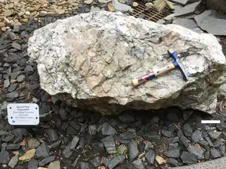 Major minerals include plagioclase, microcline, quartz, and muscovite. Perthitic textures on the microcline are possible.[1][4] Minor minerals include biotite and garnet.[1] The size of this unit ranges from inches to thousands of feet.[1] It will weather into light-colored soils.[1]