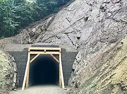 In April 2017, Bruch and Bruch Construction of Port Angeles received a $1.2 million contract to restore the 450-foot long tunnel, and widen the trail segment to roughly 12 feet.[2] This began with blasting the east end of the tunnel, opening it from end-to-end. Debris was then cleared from the tunnel, and workers began reinforcing the inside by applying "shotcrete" to the tunnel walls. Next, a Mechanically stabilized earth (MSE) wall was built around the arch pipe on the northeast entrance to the tunnel, with a facade added to represent the tunnel's original appearance.