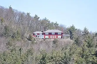 The Spur House is sited on the spur of Beech Hill, overlooking Dublin Pond, and is accessed via a winding drive off Old Common Road. It is a two-story wood-frame structure, with a hip roof and clapboarded exterior. Its main facade is five bays wide, with symmetrically placed but differently sized windows placed around the main entrance. The entrance is framed by a gabled surround, and one of the upper windows has a rounded top, corresponding in placement to the stairwell inside. The east end of the building has an open porch with pergola, while the west end has a later 20th-century addition and enclosed porch.[2]