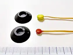 A squib is a miniature explosive device used in a wide range of industries, from special effects to military applications. It resembles a tiny stick of dynamite, both in appearance and construction, but has considerably less explosive power. A squib consists of two electrical leads separated by a plug of insulating material; a small bridge wire or electrical resistance heater; and a bead of heat-sensitive chemical composition, in which the bridge wire is embedded.[1] They can be used to generate mechanical force to shatter or propel various materials; and for pyrotechnic effects for film and live theatrics.[2]