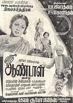 Sri Aandal is a 1948 Indian Tamil-language Hindu mythological film directed by Velsamy Kavi. Based on Andal, it stars U. R. Jeevarathnam as the title character and P. S. Govindan. The film was reasonably successful, but no print of it is known to survive, making it a lost film.