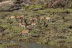 Sri Lankan axis deer are active primarily during early morning and again during the evening, but they are commonly observed near waterholes anytime. The Sri Lankan axis deer eats primarily grasses, but it also eats fallen fruits and leaves. The Sri Lankan axis deer graze closely with langur, peacock, wild buffalo, and sambar deer. They usually live in groups of between 10 and 60 animals, though herds may include up to 100 animals.