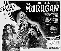 Sri Murugan is a 1946 Indian Tamil-language film produced by Jupiter Pictures and directed by M. Somasundaram and V. S. Narayanan. The film featured Honnappa Bhagavathar in the lead role. M. G. Ramachandran performed a dance number, Shiva Thandavam along with K. Malathi in the film.[2]