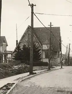 The church was originally a two-story, cross-gabled structure with wood siding and a stone foundation. Its steeply pitched roofs and corner tower exemplified Carpenter Gothic architecture. Decorative trusswork originally filled in the gable ends but were removed in the 1928 addition. The removal of the trusswork left the building austere and relatively unornamented, except for details on bargeboards and decorative eave brackets. The 1928 addition resulted in a substantial change to the church's appearance, moving the main entrance to the eastern (Arthur Street) side and adding a tower with a pyramidal roof on the southeast corner.[8]