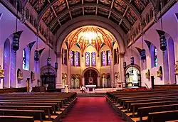 The interior is a large open expanse that is free of pillars, which was a hallmark of Egan's style.[1] The barrel vault ceiling rises to a height of 50 feet (15 m). The windows in the cathedral are translucent mosaics and depict the establishment of the Catholic faith in the United States, the State of Iowa, and the Diocese of Des Moines. They are somewhat unique as they depart from the Biblical themes or lives of the saints that are usually depicted in Catholic churches.[1][17] The rose window in the Chapel of Our Lady depicts the seven gifts of the Holy Spirit. The altar, ambo and chair in the chapel were used by Pope John Paul II during a Mass he celebrated at his historic visit to Living History Farms just outside Des Moines in 1979.[6]