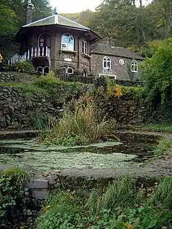 St. Ann's Well is set on the slopes of the Malvern Hills above Great Malvern. It is a popular site on a path leading up to the Worcestershire Beacon and lies on the final descent of the Worcestershire Way.[1] The spring or well is named after Saint Anne, the maternal grandmother of Christ and the patron saint of many wells. A building that dates back to 1813 houses the well or spring. Malvern water flows freely from an elaborately carved water spout. The building also hosts a cafe. During the early 20th century, the now-defunct Burrows company bottled and sold Malvern Water from this source under the "St Ann's Well" brand.