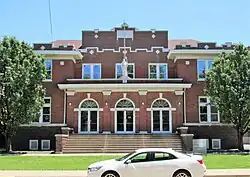 St. Benedict Parish was established in 1912 to take care of the Catholics who lived east of the downtown area. The pastoral care for the parish was given to Benedictine Monks from St. Meinrad Abbey.[4] A two-story brick building was constructed to serve as a combination church and school. It was designed by local architect Frank J. Schlotter in the Neoclassical style.[2] It was built by local contractor, and parishioner, Michael J. Hoffman. An assembly hall was located in the basement, classrooms were located on the first floor, and the church sanctuary was on the second floor. After the present church building was completed in 1928, the second floor was converted into classroom space. A Modern movement addition was completed in 1953.