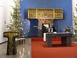 St. Bernward's Church houses several sightworthy pieces of art. The Gothic retable showing various saints and the Coronation of the Virgin dates from 1430.[5] It originally stood in Trinitatishospital, a hospital which was founded in 1230 and destroyed in 1945. There is also a remarkable statue representing Saint Bernward holding a Bernward Cross in his hand. The golden Bernward Cross which was made about 1130 is one of the most famous items in the museum of the Cathedral of Hildesheim.