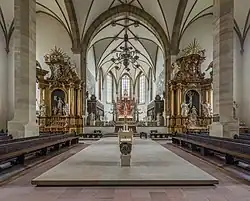 In 1495, a late-Gothic high altar was added. Around that time construction of the polygonal east choir and the transept started. However, few works of art survived the destruction caused by the Peasants' War of 1525. One of them was a Madonna by Tilman Riemenschneider (ca. 1490).[1][2]