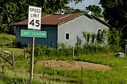 An old stagecoach road ran near here, from Hannibal, Mo. to Saint Joseph, Mo., called the "Hound Dog Trail" and dates to the early 19th century.[4] St. Catharine was founded in 1856, and is not named for Catherine of Alexandria, but instead for Mrs. Catharine Elliott, by her husband, William H. Elliott, a wealthy manufacturer. Both were born in England, and, with locals Caleb S. & Mary Farmer, joined in buying 160 acres, which was filed and recorded November 17, 1855. William and Catharine took the west half of 160 acres and laid out the town of Catharine. Afterward, the word Saint, or "St." as it was written, was added, "as a sort of joke, but as Mrs. Elliott remarked, she had no objection to being canonized as a saint, and the name became an established fact."[5][6]