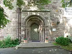 The Romanesque main portal on the south side, just behind the western transom, is particularly striking, projecting slightly from the building line; the projecting wall section is slightly rectangular, finished and emphasized at the top by a simple cornice,[24] the portal is not in the middle, but clearly offset to the left. The sandstone ashlar masonry next to the protruding portal zone is attached to the masonry of the tower without a building seam.[53] The round-arched portal itself is characterized by several stepped jambs and laterally placed columns with cube capitals and an attic base; the transition from the lateral portal jambs to the high arched field above the portal is designed as a profiled impost zone.[24] The innermost jamb, on the other hand, has a smooth transition from the transom zone and a slightly pointed arch. The Gothic lancet windows, which belong to the Maurice Chapel above the entrance hall, are arranged in close proximity at a slight distance above the portal. The outer wall area of the chapel is constructed from coarsely hewn sandstone blocks, with only large-format and carefully smoothed stones present on the originally exposed eastern edge.[27] The larger stones of the Maurice Chapel exhibit pincer holes, in contrast to the ashlars on the older west transom and in the portal zone. On the north side of the church, opposite the Moritz Chapel and portal zone, one wall area has a mixed masonry structure. Only the upper part of a walled arched door, measuring 82 centimetres in width, is still visible. This originally provided a direct passageway between the church and the cloister. Another, now walled-up arched door on the north side led from the upper floor of the cloister to the second floor of the tower.[54]