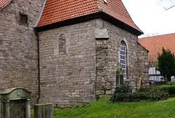 During the same construction period, a chapel of Saint Maurice with three Gothic lancet windows was built above the entrance on the south side of the church.[27] The chapel of St. Maurice extended over two bays and the wall of the side aisle was raised for the chapel at this point.[28]Access was through the gallery. Due to the size of the chapel room, the east wall was not on the axis of the existing pillar, but one meter east of it. The wall on the first floor was supported by a wall directly below it, creating a separate entrance hall under the chapel. The altar of St. Maurice's Chapel had its brick foundation, visible as a column in the northeastern corner of the vaulted entrance hall.[26] The altar, and thus the chapel, was first documented in 1415 on the occasion of the establishment of a mass for the souls.[29] According to the Göttingen chronicler Franciscus Lubecus, another chapel was built by Abbot Gunter von Roringen before he died in 1300 as a burial place for the abbots of Reinhausen monastery. This dating is questionable because Gunter was still abbot of the monastery in 1382 and 1385.[30]