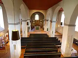 The western part of the church, with the basements of both towers, the eastern intermediate bays and the western extension of the central nave up to the second pair of piers, is separated from the main space of the church. To the north of the Gothic entrance hall, this separation consists of a wall that was added later. The area separated in the western part is used as a parish hall and winter church.[27] The area visually separated from the outside in the southern view, namely the towers and the adjoining intermediate bay with the portal zone and the Maurice chapel, is also recognizable in the interior layout.[47] The western extension of the central nave has a flat-beamed ceiling. The northern part, i.e. the extension of the northern aisle to the west, is connected to the chancel by two pointed arches running along the length of the church. The arches, the adjoining two-bay groined vault to the north and the corner of the north tower are supported by a square pillar one meter thick. The first floor of the north tower, with the adjoining intermediate bay, thus forms an optically separate part of the community room, in which a kitchenette is installed. Corresponding columns on the south side of the presbytery and the bricked arches between them indicate a similar construction method. However, while the eastern vault on the south side of the entrance hall has been preserved, the western vault in the south tower has been removed. In 1966, a staircase was installed there, with a toilet room below.[47] The other two supports of the belt arches are a pillar in the extension of the partition wall between the parish hall and the nave, which originally separated the side and main naves of the church, and the western outer wall.