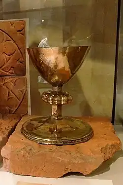 In the eastern wall of the choir, there are also the remains of a Gothic stone sculpture with a central pinnacle that has a crown carried by two angels instead of a finial.[40] Its original function is interpreted as the crowning of a sacramental niche.[64][89] It is said to be a much cruder copy of a sacrament niche from St. John's Church in Göttingen.[61]