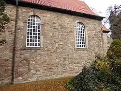There is a cast iron tombstone on both the north and south walls of the choir. Both date from the second half of the 16th century.[3] The slab on the south wall of the choir was made for the monastery's pledge holder Christoph Wolff von Gudenberg, who died on February 15, 1569, and the one on the north wall was made for Melchior von Uslar and his wife Margarete von Ohle, who died on September 8, 1574.[65] On the east wall of the choir is a painted wooden plaque from 1735 commemorating Maria Magdalena Hinüber, born from Bush.[78] The two cast-iron memorial plaques were placed side by side on the south wall of the choir until after the Second World War; the wooden plaque hung together with another wooden epitaph above the plaques.[90] The second wooden plaque was also in the form of a medallion with side vines and a crown; it commemorated the bailiff Christian Erich Hinüber, who died in 1752 and is also named on the surviving plaque as the husband of the deceased.[92] Another stone gravestone from 1706 for Veit Andreas Hornhardt on the east wall of the north aisle is heavily weathered.[93] Hornhardt was Amtmann of the Reinhausen district from 1680 to 1705.[94]