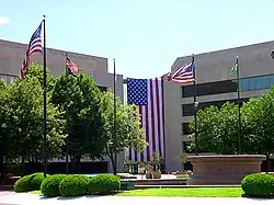 Today's courthouse is a modernist building of concrete and glass; the basic plan is the shape of the letter "L", five stories tall. It sits high above the surrounding street; a staircase providing access from the sidewalk is interrupted by two landings. Architects Hellmuth, Obata + Kassabaum included elements such as a pool at the center of the building and a glass-covered bridge providing access to a parking garage across one of the surrounding streets.[5]: 138