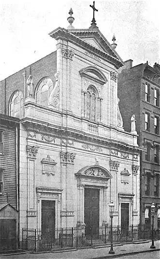 The parish was established in 1903 and staffed by the Franciscan Friars, with a parochial school staffed by a community of Sisters of St. Francis.[2] The 1907 church building, designed by Nicholas Serracino, was closed in 1937[3] and razed to provide access for the new Lincoln Tunnel.[4] Donatus Buongiorno painted the murals in the church.[5] Metropolitan Opera baritone Alfredo Gandolfi married soprano Alice Kurkjian at St. Clare Church on February 3, 1934.[6]