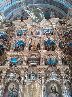 The cross-shaped church is 25.2 meters long by 9.5 meters wide, rising to a height of 13.9 meters. The narthex is small, the altar elongated. The Christ Pantocrator dome rises above the apses; it has eight sides on a square base. The roof is covered in tin. The facades are ornamented in Greek Revival style, while the pediment is in profile. The side pilasters are Doric, beneath a continuous floral decoration. The western side has six very tall Ionic columns, above which are medallions of the Twelve Apostles. Above the 1852 pisanie is a recessed icon of the patron saint, flanked by rectangular frames with Saints Peter and Paul. The interior painting is in realist style and does not respect the Byzantine canons. The Baroque iconostasis was carved at Buzău.[1]