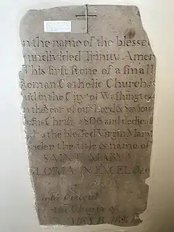 The church's southern entrance contains a relic of the first Catholic chapel built in Washington, D.C. This is an engraved dark sandstone which was the cornerstone of St. Mary's Chapel, a.k.a. "Barry's Chapel", built by James Barry (1755?–1808) and dedicated in 1806.[8] Barry's Chapel stood at F & 10th St SW under the present-day Interstate 395 highway.