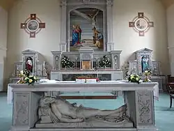 Originally built to an "L" shape,[5] the church was extended and an additional transept was added in 1809.[1] The main altar holds a statue, known as The Dead Christ, which was sculpted by John Hogan (1800–1858).[8] A painting of the crucifixion, behind the altar, is attributed by some sources to the artist John O'Keeffe (c.1797–1838).[10] The church was further extended in the 1860s, and additional work undertaken on the altar, in the 1870s, by ecclesiastical architect George Goldie (1828–1887).[2]