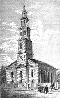 The original St. George's was a chapel built in 1752 by Trinity Church on Chapel Street (now Beekman Street) in Lower Manhattan, for the convenience of its congregants who lived on the east side of the city. That building had a columned portico, arched windows and a hexagonal steeple.[7][8] In 1811 the congregation became independent,[9][10] and in 1846–1856 they built a new church uptown, on very fashionable Stuyvesant Square.