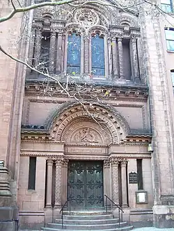 St. George's Episcopal Church is a historic church located at 209 East 16th Street at Rutherford Place, on Stuyvesant Square in Manhattan, New York City. Called "one of the first and most significant examples of Early Romanesque Revival church architecture in America",[6] the church exterior was designed by Charles Otto Blesch and the interior by Leopold Eidlitz. It is one of the two sanctuaries of the Calvary-St. George's Parish.