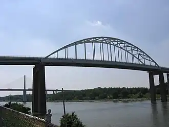 The St. Georges Bridge is a steel tied arch bridge that carries U.S. Route 13 (US 13) across the Chesapeake & Delaware Canal in St. Georges, Delaware. Built by the U.S. Army Corps of Engineers and opened in 1942 as a high-level crossing, the bridge was the first four-lane, high-level crossing to span the canal. It replaced a previous vertical lift bridge which was damaged when a German merchant ship collided with it.[3]