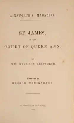 While Ainsworth served as editor for his own magazine, Ainsworth's Magazine, he included many of his own works. Of these, Saint James's or the Court of Queen Anne, An Historical Romance ran from January 1844 until December 1844. It was also published as a three volume set in 1844 by John Mortimer. The work was illustrated by George Cruikshank, which marks the last time that Ainsworth and Cruikshank collaborated on a novel.[1]