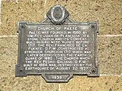 Paete was established as town in 1580 by Franciscan priest Fray Juan Plasencia under the patronage of Saint Lawrence.[1][2] Due to the scarcity of religious men, it was annexed to the visita of Lumban until October 20, 1600, and to Pangil until 1602.[1] The first parish priest of Paete, Fray Pedro de Buenaventura, was appointed in 1602.[1] The first stone church and convent were built by Paete natives under the supervision of Fray Andres de Puertellanoin 1646 but it was later destroyed by an earthquake in 1717.[2] A new stone church was started the same year under Fray Francisco de la Fuente.[2][3] It was completed in 1840 under the term of Fray Luis de Nambroca.[3][4] The church and convent were again destroyed by the 1880 Luzon earthquake.[2][5] Father Gregorio Martin built a temporary small church of 33 m (108 ft) by 13.2 m (43 ft) by 8.6 m (28 ft).[6] In 1884, the church was rebuilt under Father Pedro Galiano, now facing the Laguna lake but this was again destroyed by another earthquake on August 20, 1937.[2] The church served as a dungeon and torture house to the people of Paete during the Japanese occupation of the Philippines in World War II.
