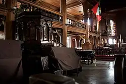 According to the first 1846 edition of The Church of England Magazine, the current church is 156 feet (48 m) long and 46 feet (14 m) wide.[7] The length of the transept is 104 feet (32 m).[7] The building is made from freestone, with stained glass windows and dark pitch pine furnishings.[7] A unique feature in the cathedral is the pitch pine interior structure and cladding to provide lateral reinforcing for earthquake or hurricane loads. As a result that the cathedral is known by the epithet "a building within a building." The cathedral has two 70 feet (21 m) high towers built in baroque style of architecture with cupolas topping them, described as "slightly awkward,"[6] and are painted in an aluminum color. This design had invited derision when built as representing "a pagan temple with two dumpy pepper pot towers", while now it is extolled as the best cathedral in the West Indian province.[2][3] The interior decor of the church is dominated by dark pine furnishings and marble tablets on the walls, some of them were salvaged after earthquakes from the old churches that stood on the spot.[6]